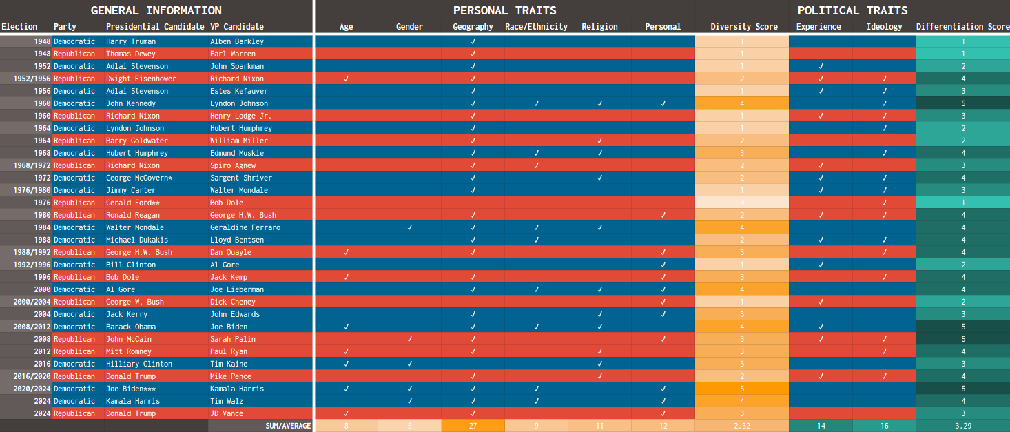 The chart below documents the rapid evolution of the vice presidency and the rapid evolution in what Americans regard as diversity. With two exceptions, every vice president of the past twenty years has had at least three personal traits distinguishing them from the president, whether that trait is their age, gender, race, ethnicity, religion, geography, or background.
